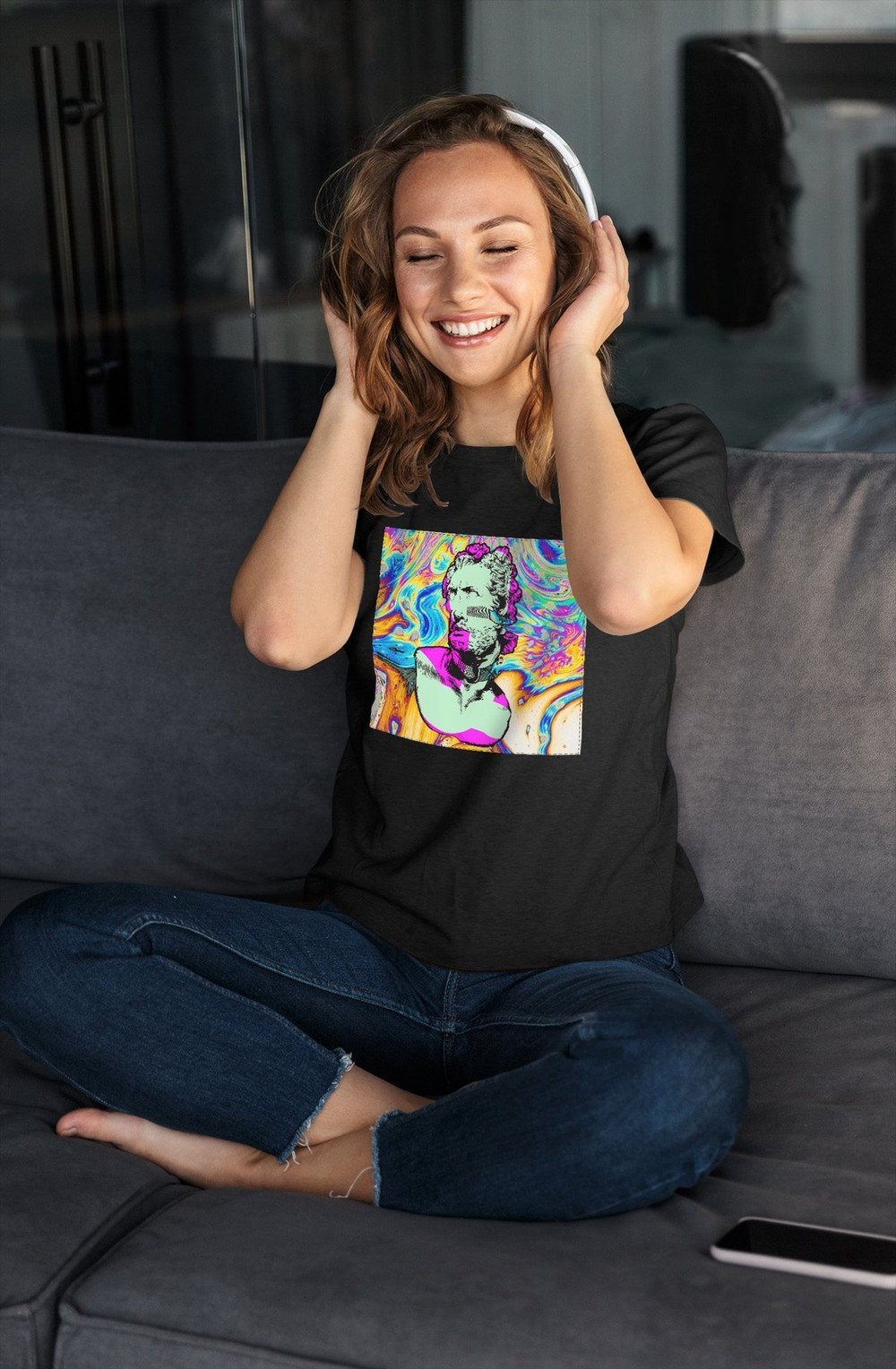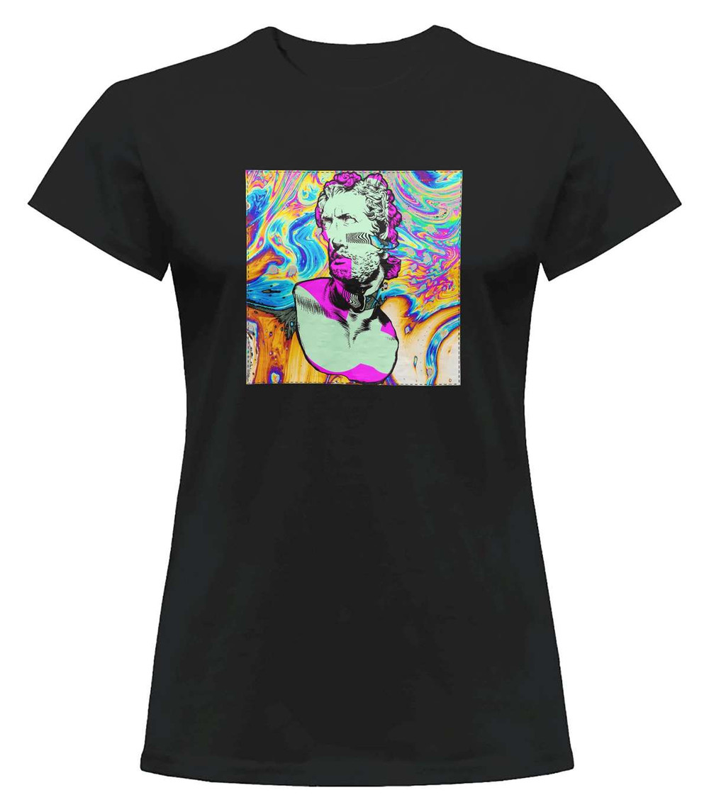 Bluzka ma damski, dopasowany krój z bardzo krótkimi rękawkami. Naszywka, która jest niezaprzeczalnym centrum uwagi tej bluzki, wykonana jest z przyjemnego w dotyku materiału. Dzięki tej starannie dobranej kombinacji materiałów, nadruk jest nie tylko wyrazisty i szczegółowy, ale także trwały zachowując swoje intensywne kolory nawet po wielu praniach.