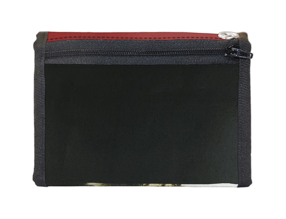 - Portfel posiada aż 10 przegródek, w tym przegródki na dokumenty, banknoty, karty, oraz przezroczyste miejsca na zdjęcia. Przegródka na drobne zamykana jest na suwak. W portfelu bez problemu mieści się dowód rejestracyjny, jak i legitymacja szkolna.