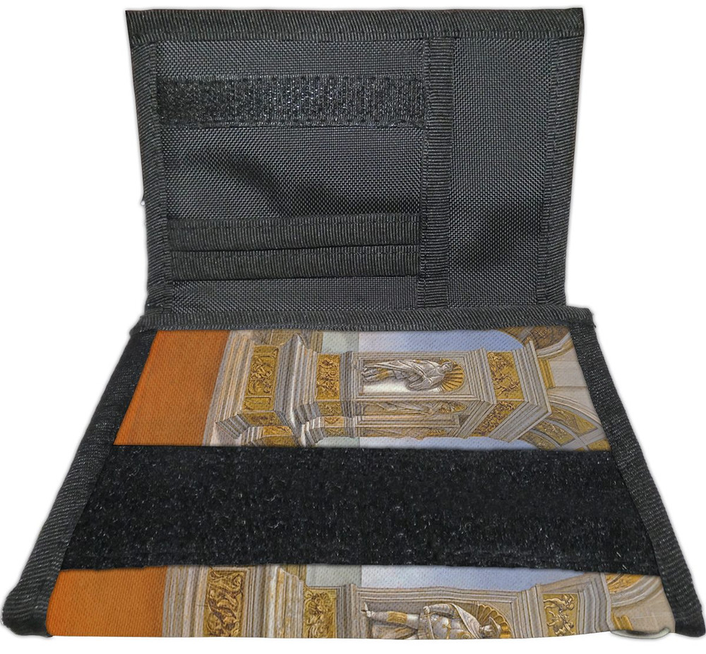 - Portfel zapinany jest na rzep, oraz posiada otwór na łańcuch, lub breloczek np. z kluczami.