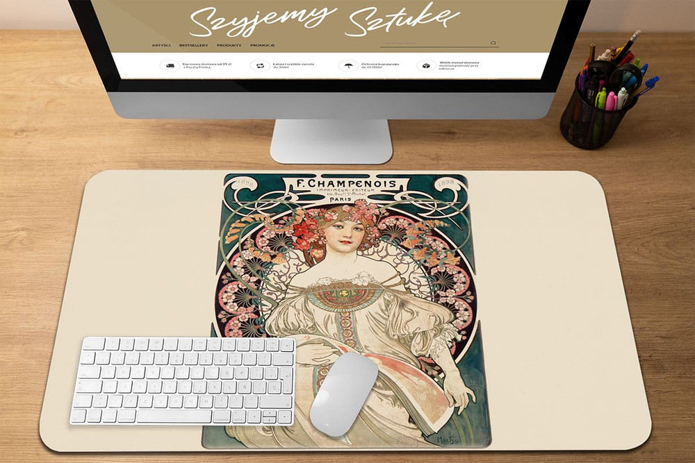 Podkładka pod mysz z nadrukiem na biurko. Rozmiar podkładki to 60 x 40 cm.