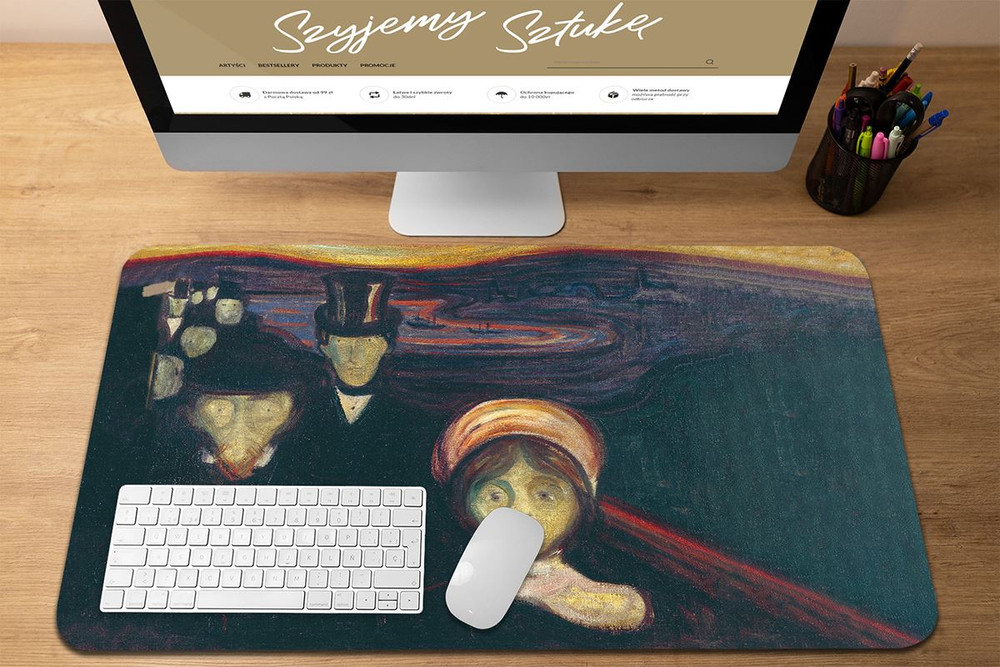 - Podkładka pod mysz w rozmiarze 60 x 40 cm. Praktyczna podkładka mata na biurko, która oprócz praktycznego zastosowania dodatkowo ozdobi Twoje biurko wyjątkowym dziełem sztuki.