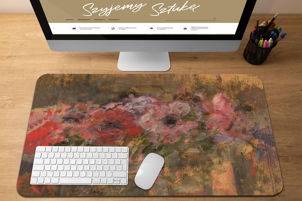 - Podkładka pod mysz w rozmiarze 60 x 40 cm. Praktyczna podkładka mata na biurko, która oprócz praktycznego zastosowania dodatkowo ozdobi Twoje biurko wyjątkowym dziełem sztuki.