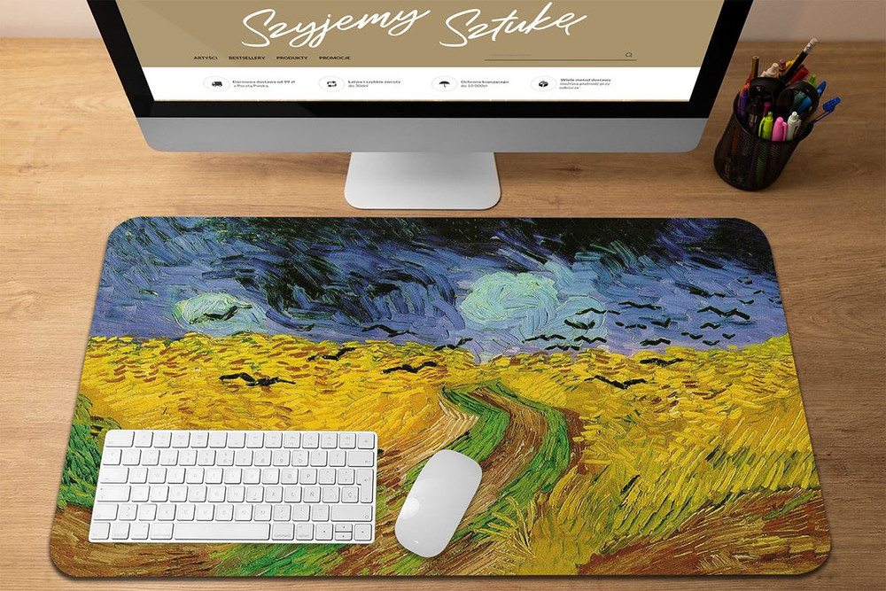 - Podkładka pod mysz w rozmiarze 60 x 40 cm. Praktyczna podkładka mata na biurko, która oprócz praktycznego zastosowania dodatkowo ozdobi Twoje biurko wyjątkowym dziełem sztuki.