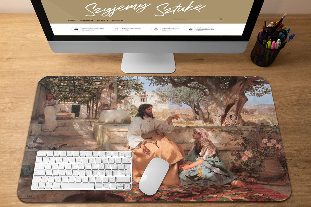 • Podkładka pod mysz w rozmiarze 60 x 40 cm. Praktyczna podkładka mata na biurko, która oprócz praktycznego zastosowania dodatkowo ozdobi Twoje biurko wyjątkowym dziełem sztuki.
