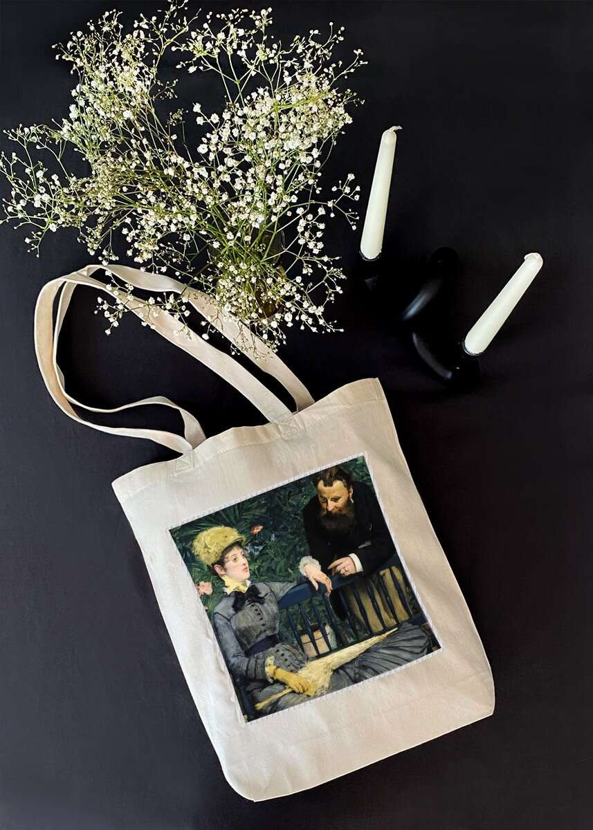 - Bawełniana torba z dużą naszywką z motywem sztuki malarskiej.