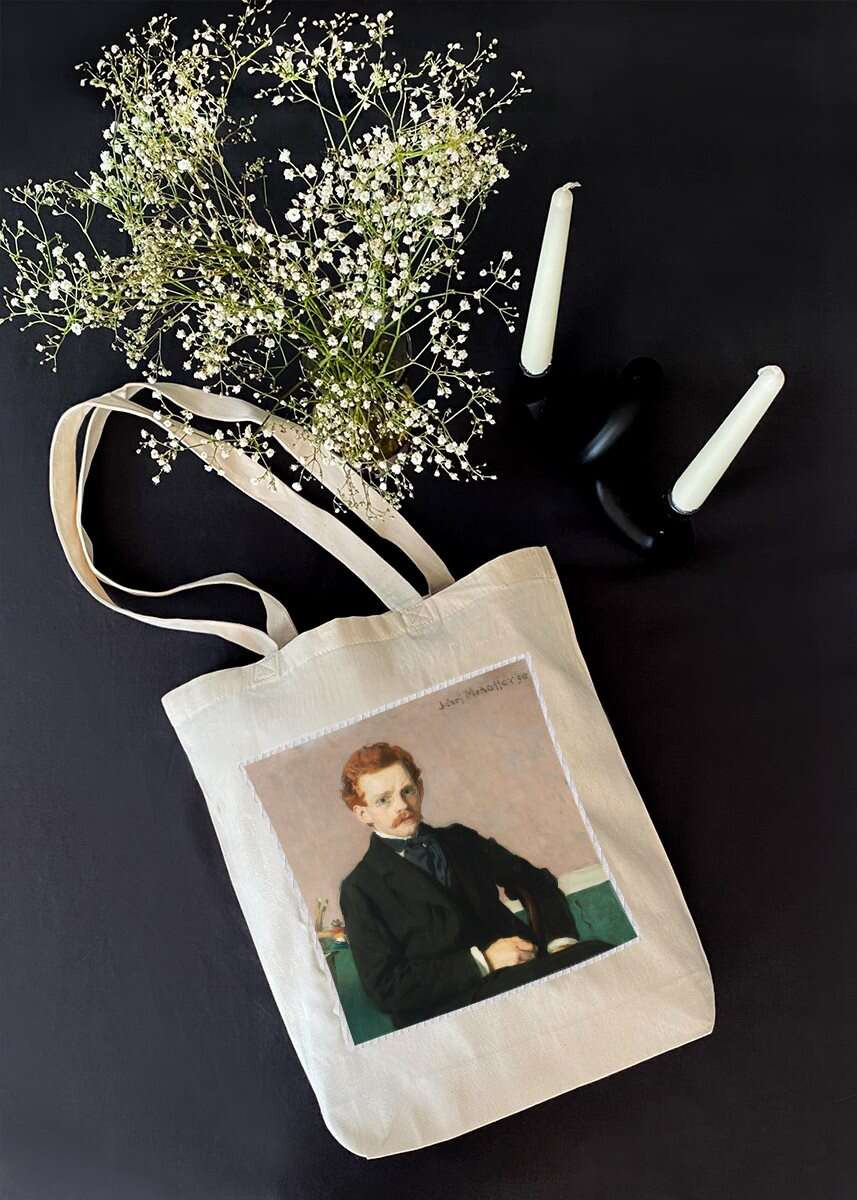 - Bawełniana torba z dużą naszywką z motywem sztuki malarskiej.