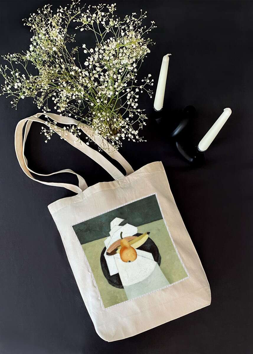 • Bawełniana torba z dużą naszywką z motywem sztuki malarskiej.