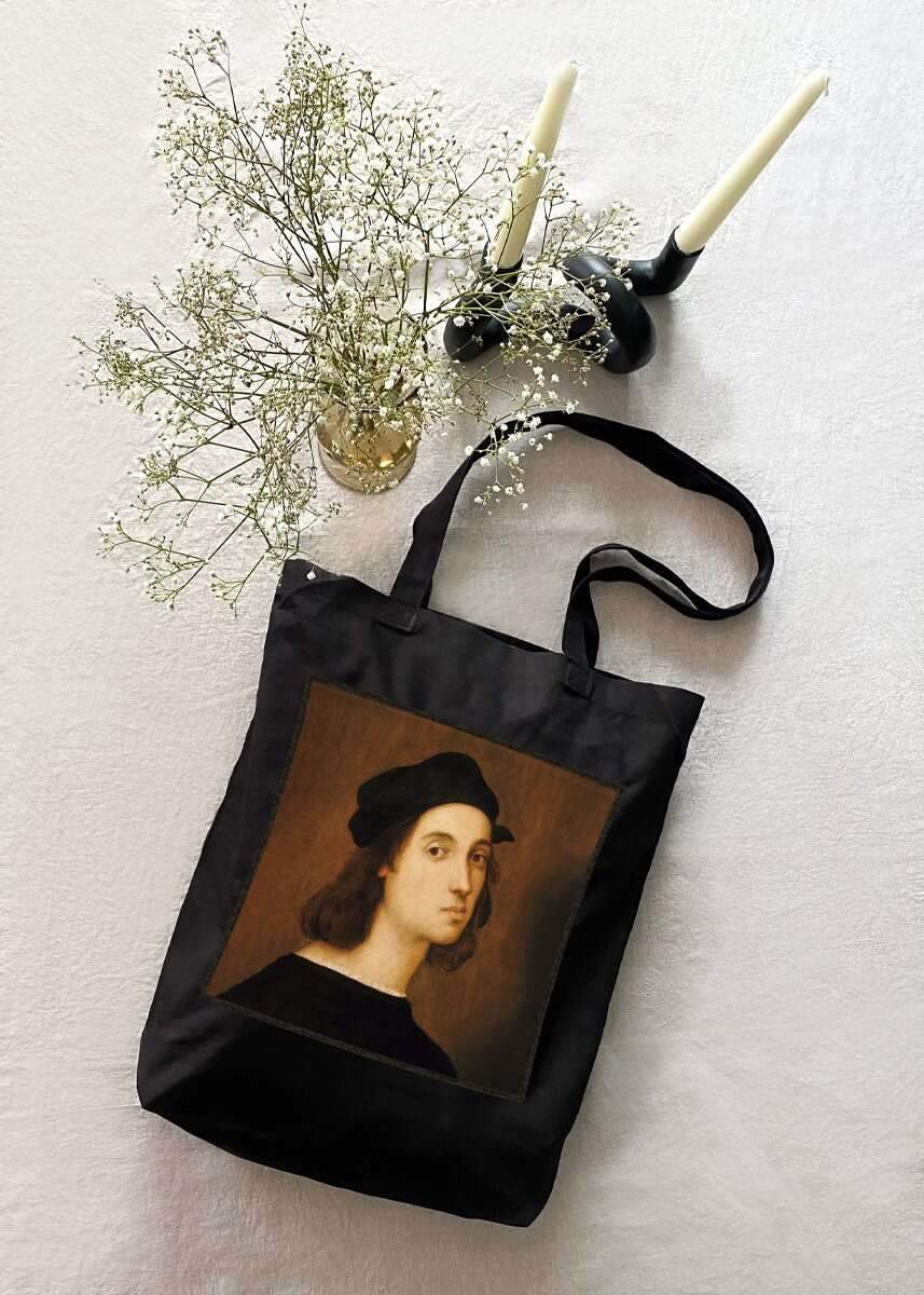 - Bawełniana torba z dużą naszywką z motywem sztuki malarskiej.