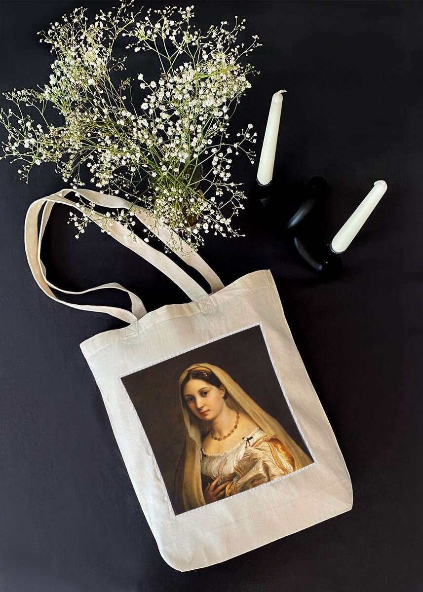 - Bawełniana torba z dużą naszywką z motywem sztuki malarskiej.