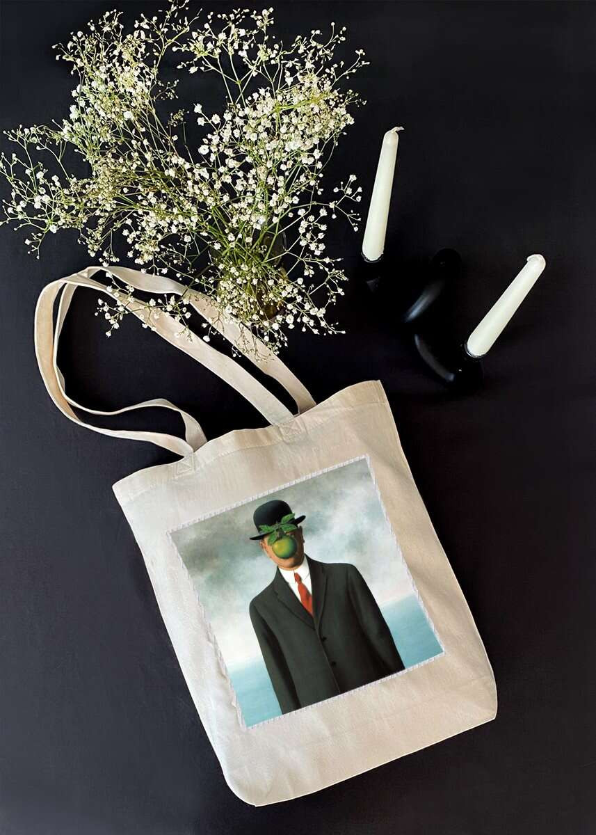 - Bawełniana torba z dużą naszywką z motywem sztuki malarskiej.