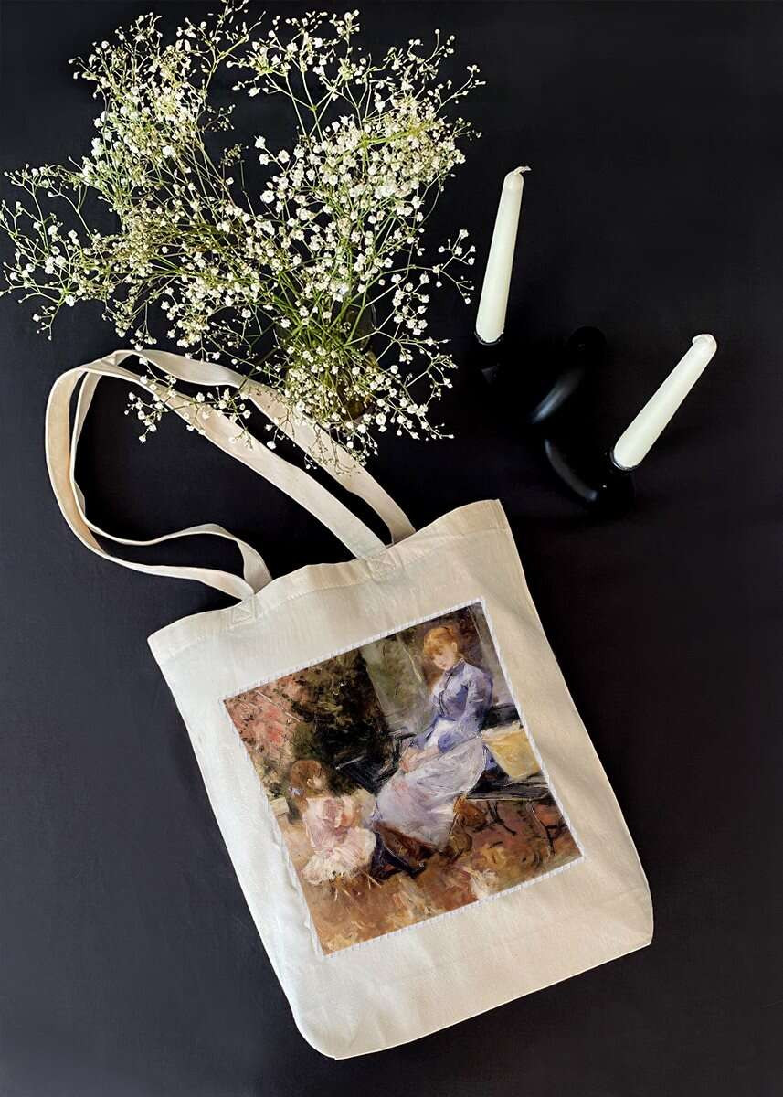 - Bawełniana torba z dużą naszywką z motywem sztuki malarskiej.