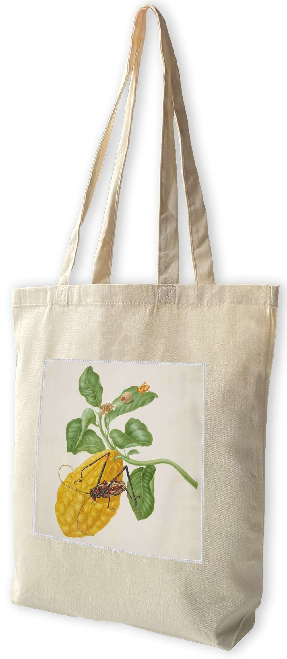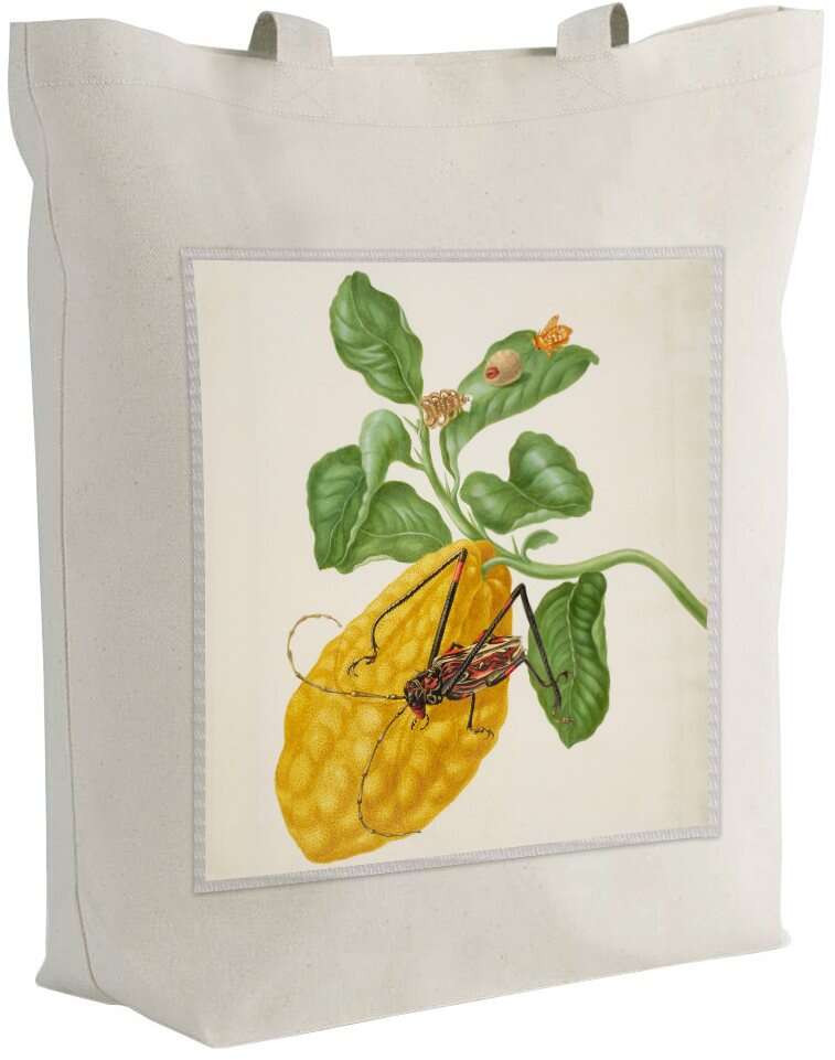 Torba z naszywką Cytryna z gąsienicą małpy i chrząszczem harlekin Maria Sibylla Merian