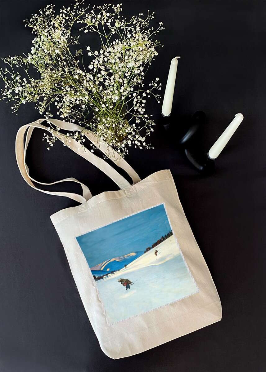 • Bawełniana torba z dużą naszywką z motywem sztuki malarskiej.
