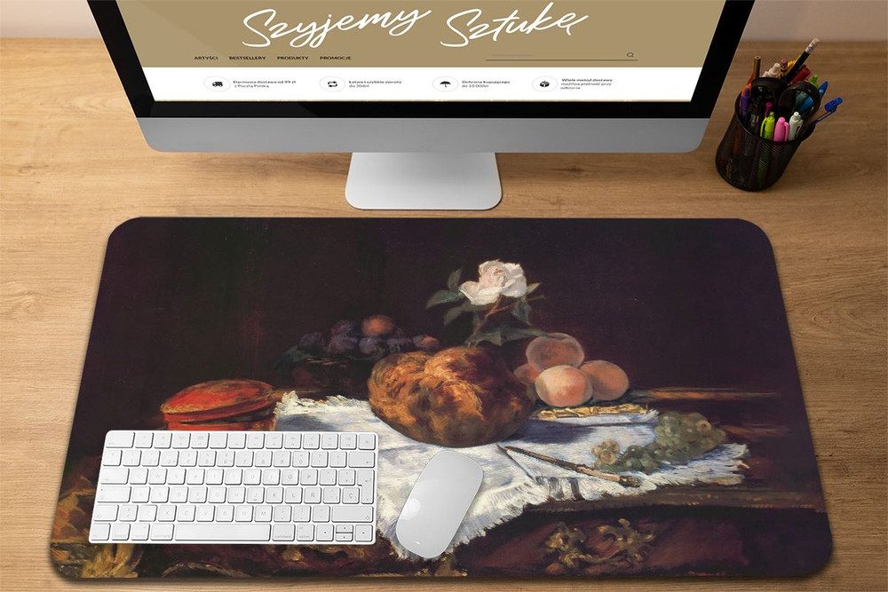 Podkładka pod mysz z nadrukiem na biurko. Rozmiar podkładki to 60 x 40 cm.