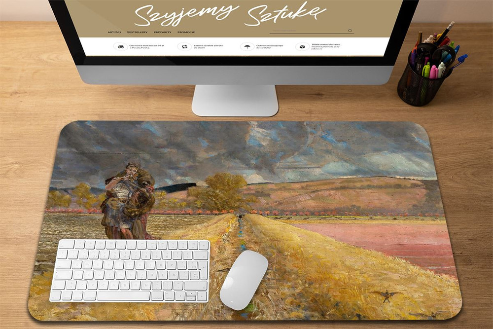 - Podkładka pod mysz w rozmiarze 60 x 40 cm. Praktyczna podkładka mata na biurko, która oprócz praktycznego zastosowania dodatkowo ozdobi Twoje biurko wyjątkowym dziełem sztuki.