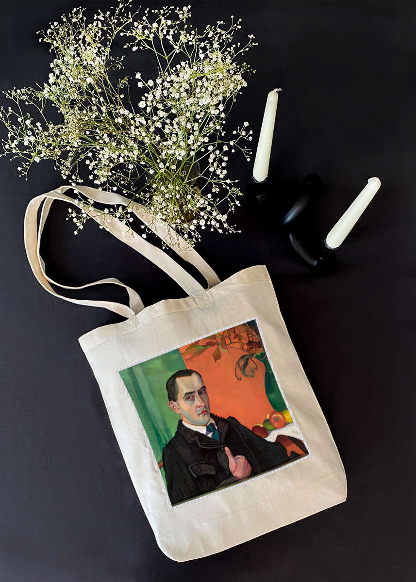 • Bawełniana torba z dużą naszywką z motywem sztuki malarskiej.