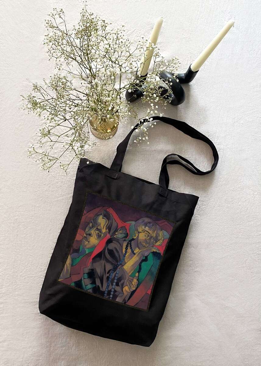 • Bawełniana torba z dużą naszywką z motywem sztuki malarskiej.