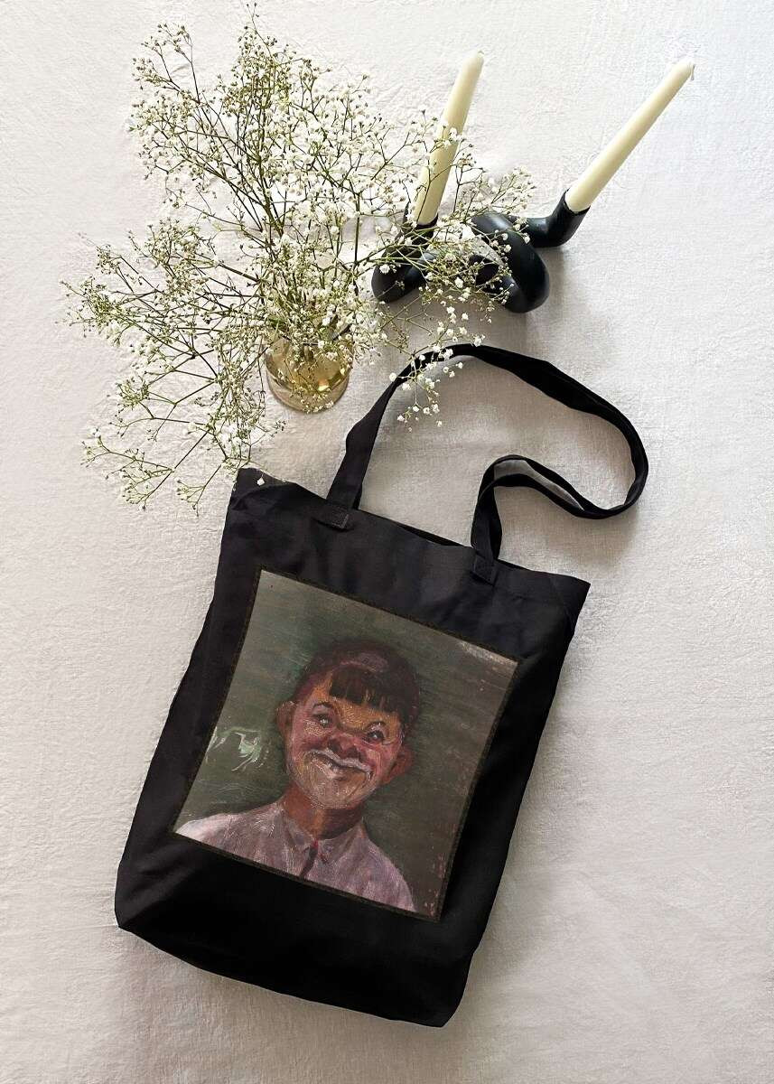 • Bawełniana torba z dużą naszywką z motywem sztuki malarskiej.