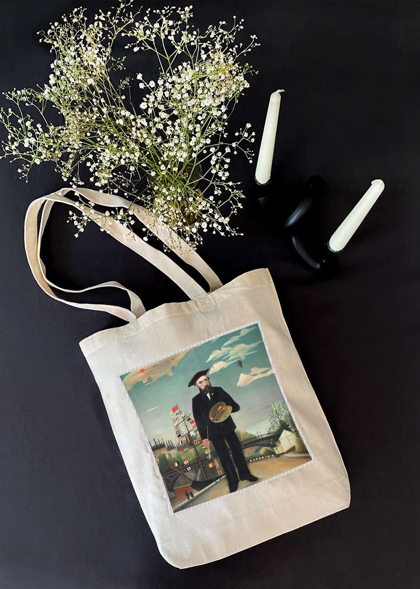 • Bawełniana torba z dużą naszywką z motywem sztuki malarskiej.