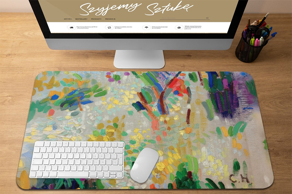 - Podkładka pod mysz w rozmiarze 60 x 40 cm. Praktyczna podkładka mata na biurko, która oprócz praktycznego zastosowania dodatkowo ozdobi Twoje biurko wyjątkowym dziełem sztuki.