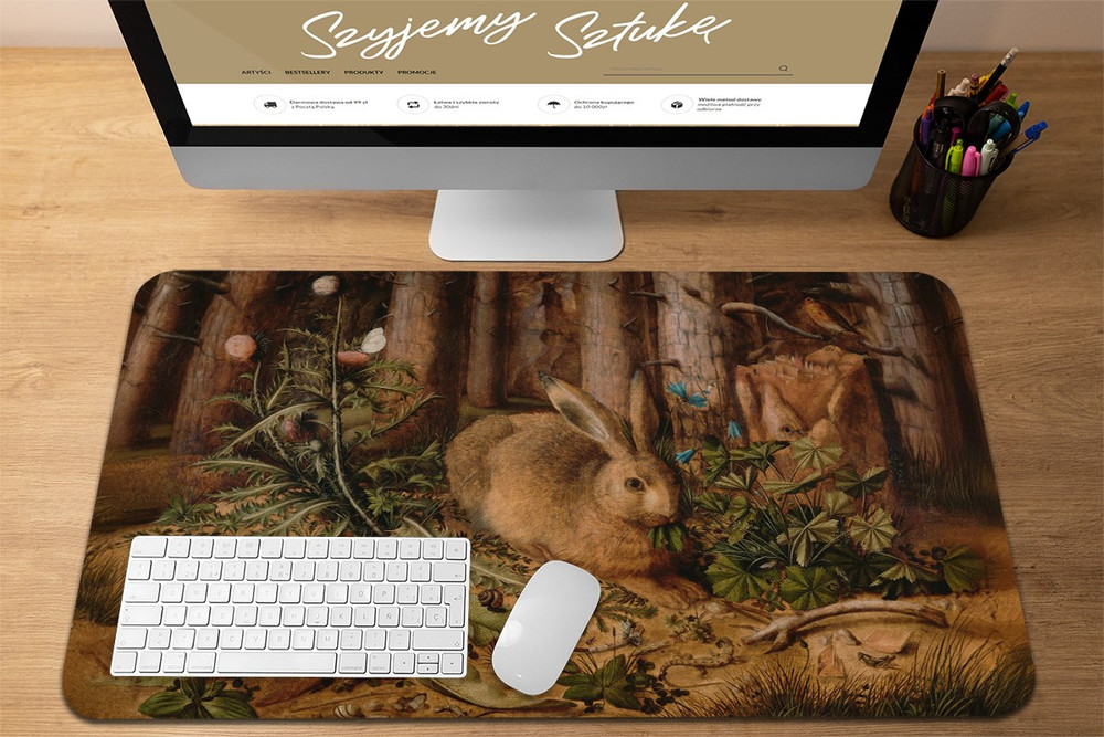 - Podkładka pod mysz w rozmiarze 60 x 40 cm. Praktyczna podkładka mata na biurko, która oprócz praktycznego zastosowania dodatkowo ozdobi Twoje biurko wyjątkowym dziełem sztuki.