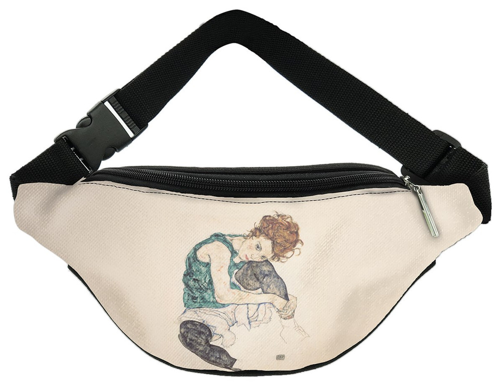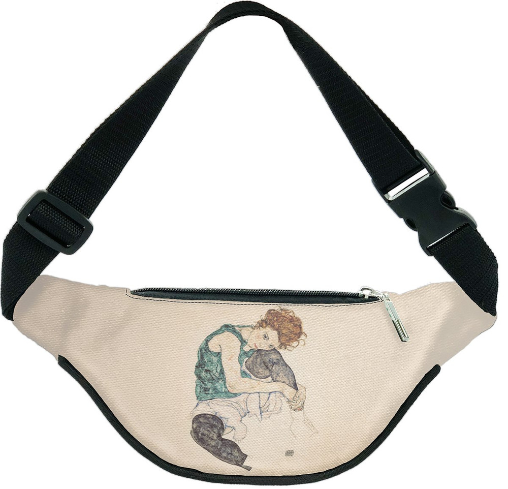 Ta wyjątkowa torba biodrówka zdobi się reprodukcją dzieła „Siedząca kobieta z podniesionym kolanem” autorstwa Egon Schiele. Grafika zachowuje bogactwo kolorów i szczegółów dzięki nadrukowi FullPrint, który odwzorowuje każdy detal. Ta nerka jest zarówno funkcjonalna, jak i estetyczna, idealna na co dzień i do noszenia sztuki blisko siebie.