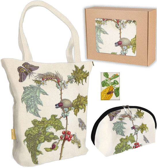 Zestaw inspirowany twórczością Marii Sibylli Merian. Zawiera torbę, kosmetyczkę i magnes. Merian była pionierką w badaniach nad przyrodą, w szczególności owadami, a jej prace połączyły sztukę z nauką. Urodzona w XVII wieku, zrewolucjonizowała sposób, w jaki ludzie postrzegali naturę, szczególnie dzięki swoim szczegółowym ilustracjom procesów metamorfozy owadów. Jej botaniczne i entomologiczne ryciny, pełne precyzyjnych detali i barw, do dziś budzą zachwyt zarówno wśród naukowców, jak i miłośników sztuki. Zestaw zainspirowany Merian to doskonały wybór dla tych, którzy cenią elegancję połączoną z naukową pasją do natury. Zestaw zapakowany w eleganckie tekturowe pudełko z okienkiem, gotowe do wręczenia. W zestawie to Ty wybierasz jaki obraz nadrukujemy na torbie, magnesie i kosmetyczce. Na każdym produkcie wybierz obraz który chcesz.