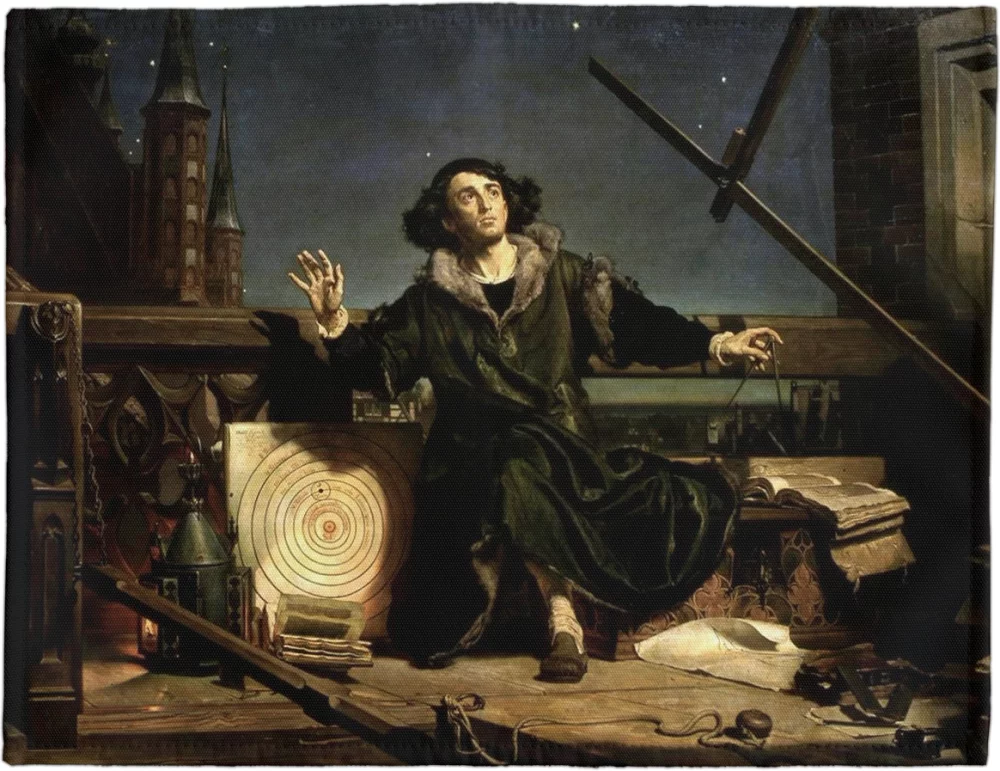 Namalowany w 1873 roku, 'Astronom Kopernik, czyli rozmowa z Bogiem' przedstawia Mikołaja Kopernika obserwującego niebo z wieży katedry we Fromborku. Dzieło ukazuje moment refleksji astronoma nad tajemnicami wszechświata, symbolizując jednocześnie związek nauki z duchowością.