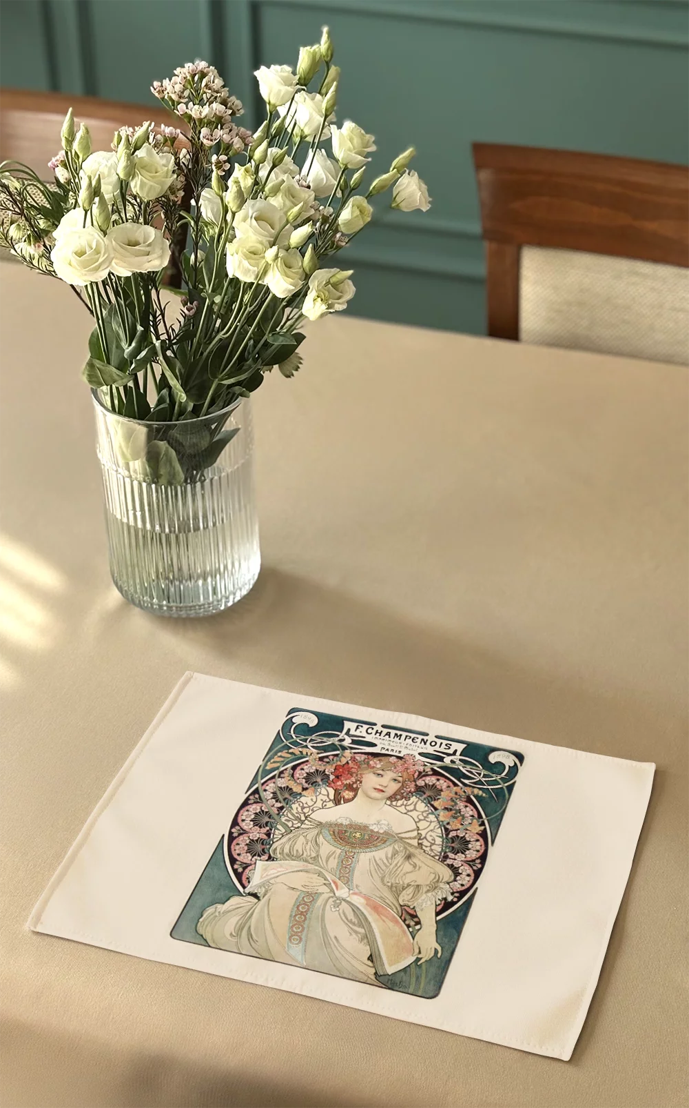 - Materiałowa podkładka na stół o wymiarach 40 x 30 cm. Na podkładce znajduje się obraz: Alfons Mucha