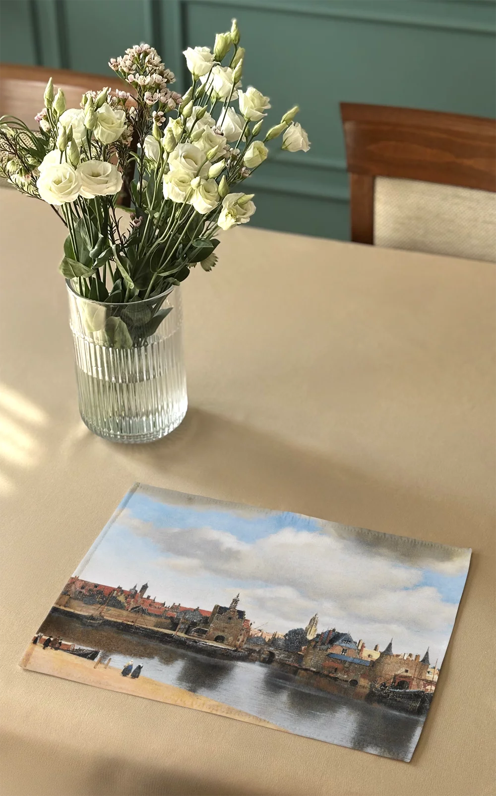 - Materiałowa podkładka na stół o wymiarach 40 x 30 cm. Na podkładce znajduje się obraz: Jan Vermeer