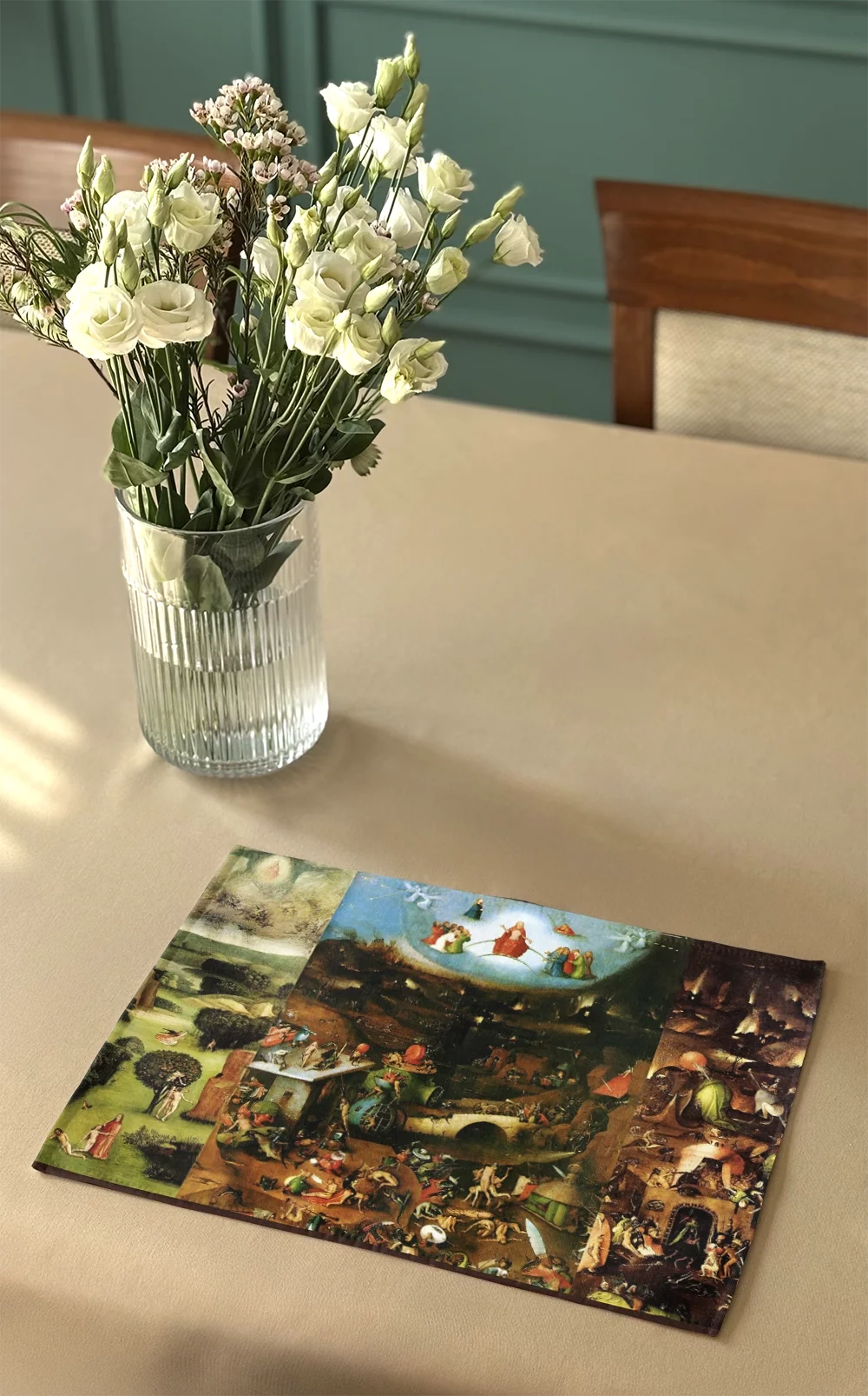 - Materiałowa podkładka na stół o wymiarach 40 x 30 cm. Na podkładce znajduje się obraz: Hieronim Bosch