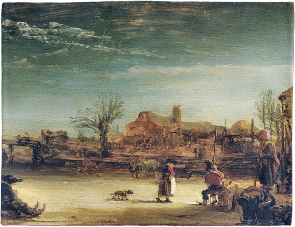 „Zimowy pejzaż Rembrandt” – artysta rzadko malował sceny zimowe, a jeśli tak, to często w formie szkiców lub rysunków. Znane są jego prace graficzne ukazujące pejzaże w chłodnej aurze, odzwierciedlające fascynację światłem i atmosferą pory roku.