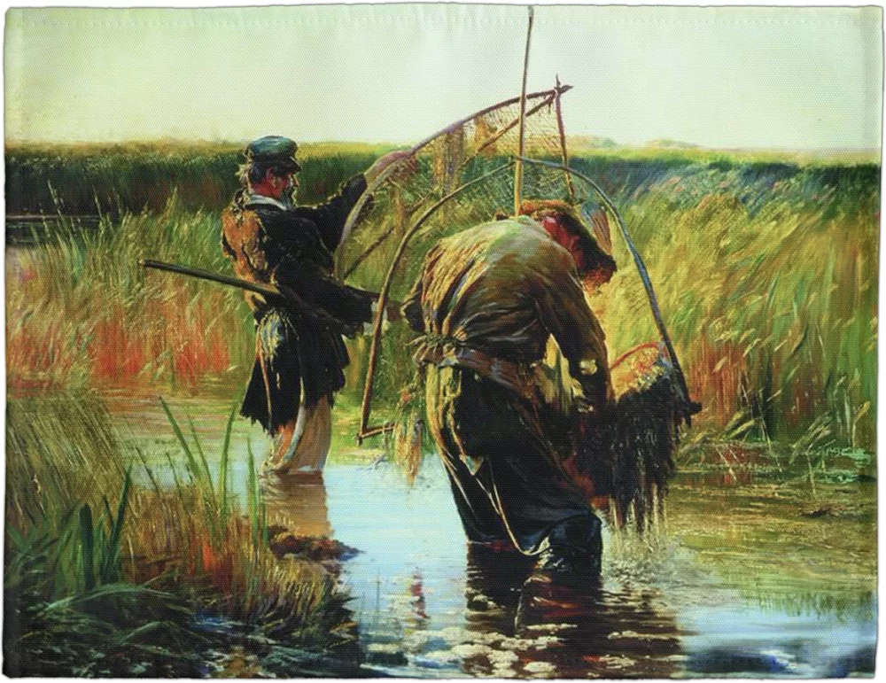Ten obraz ukazuje grupę rybaków w trakcie połowu w płytkiej wodzie. Wyczółkowski skupia się na oddaniu refleksów światła na tafli, wykorzystując jasną paletę i delikatne pociągnięcia pędzla.