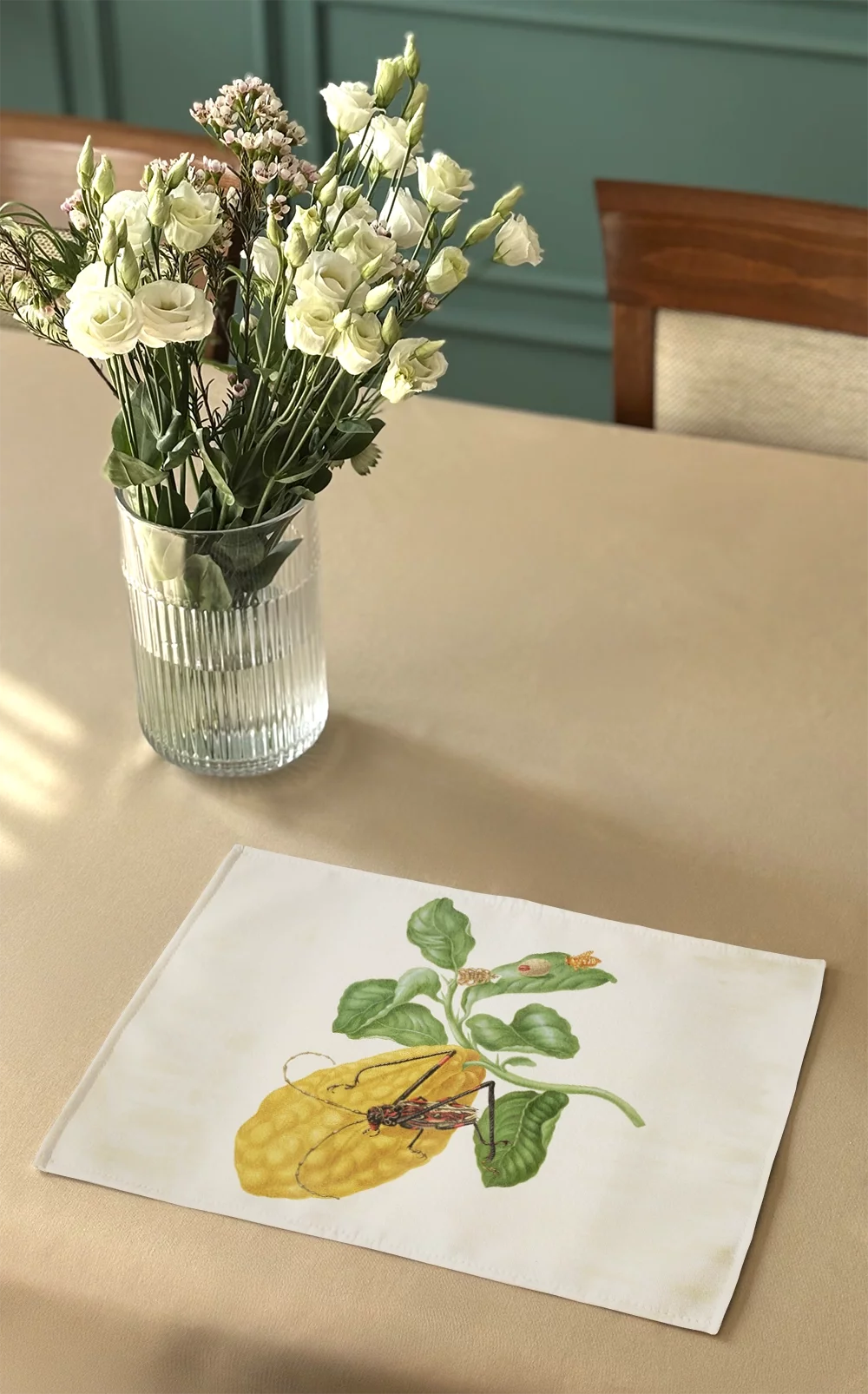 - Materiałowa podkładka na stół o wymiarach 40 x 30 cm. Na podkładce znajduje się obraz: Maria Sibylla Merian