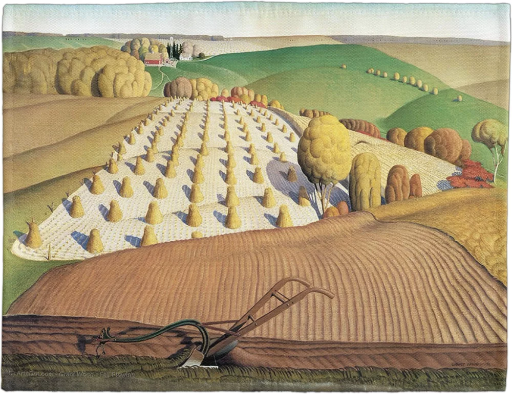 „Fall Plowing” (1931) ukazuje jesienne oranie pól w rodzinnej okolicy Wooda. Pastelowe barwy i miękkie, pofałdowane kształty krajobrazu nadają scenie sielankowy charakter, nawiązujący do stylu regionalizmu i idealizacji amerykańskiej wsi.