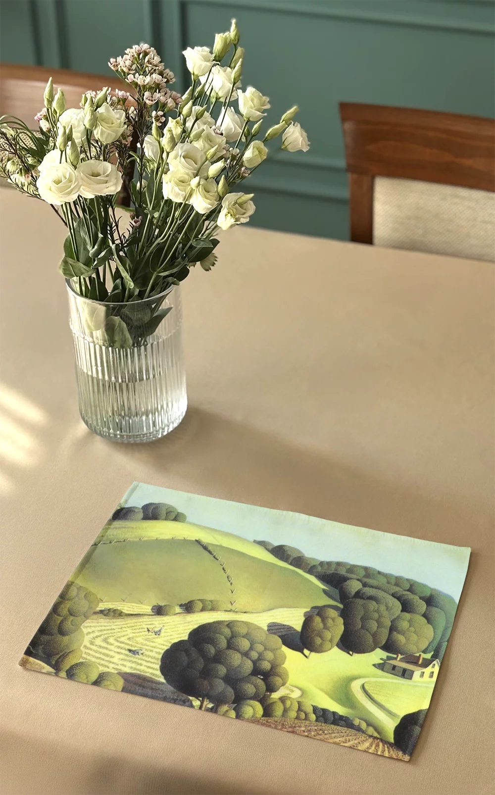 • Materiałowa podkładka na stół o wymiarach 40 x 30 cm. Na podkładce znajduje się obraz: Grant Wood