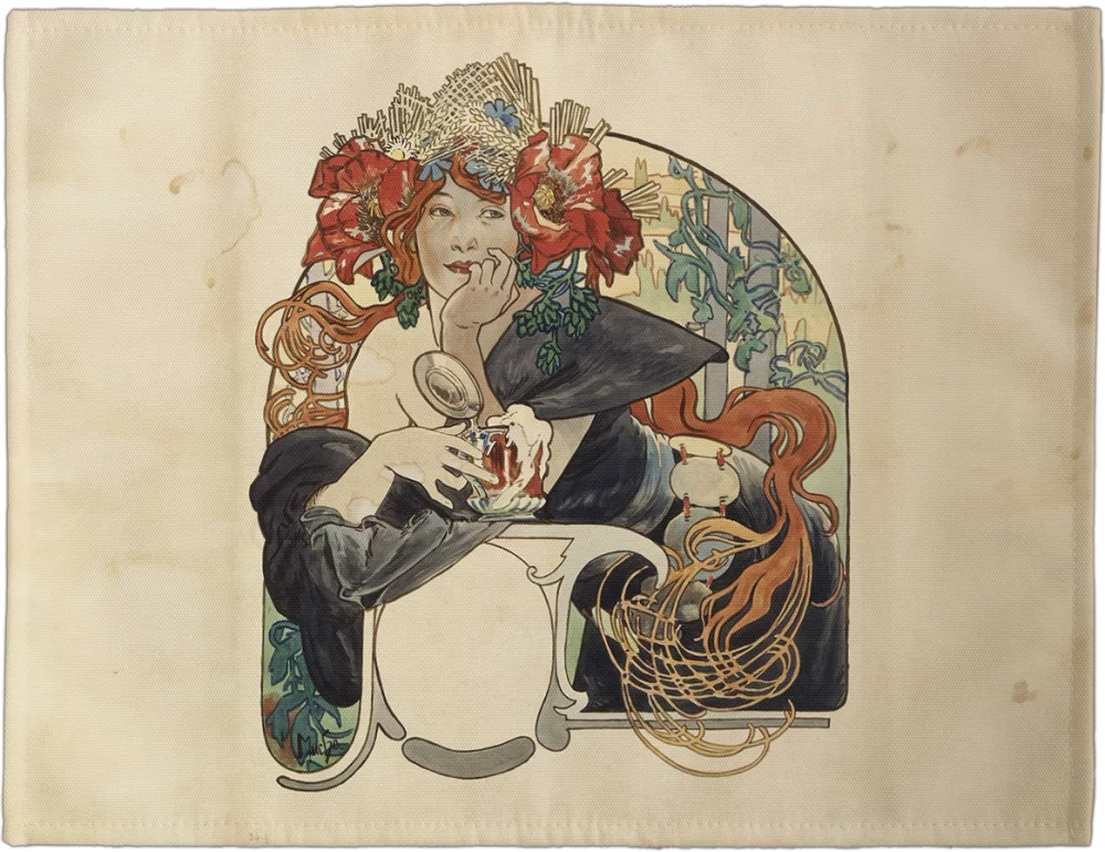 - Materiałowa podkładka na stół o wymiarach 40 x 30 cm. Na podkładce znajduje się obraz: Alfons Mucha