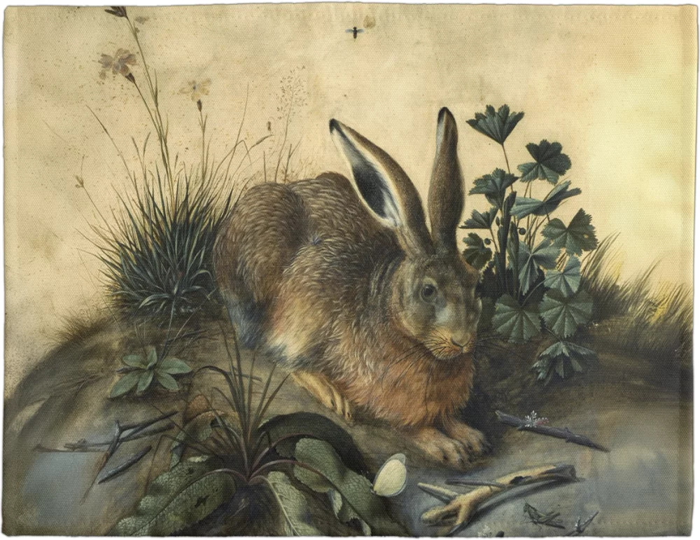 Kolejna kompozycja zająca w twórczości Hoffmanna, prawdopodobnie inspirowana słynnym „Młodym zającem” Dürera. Artysta kontynuuje tradycję wiernego, drobiazgowego odwzorowania fauny, z naciskiem na realistyczne ujęcie anatomii i faktury futra.