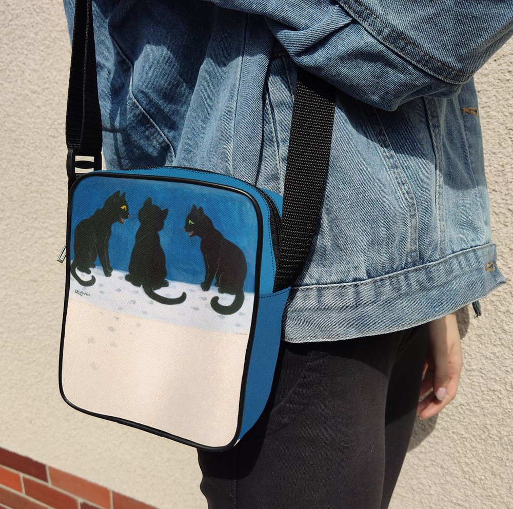 - Torba Listonoszka Czarne koty na śniegu Louis Wain z nadrukiem FullPrint inspirowanym sztuką ✨ Kompaktowa torba na ramię, szyta w Polsce ✂️ z trwałego materiału, z możliwością dodania własnego napisu ✍️.