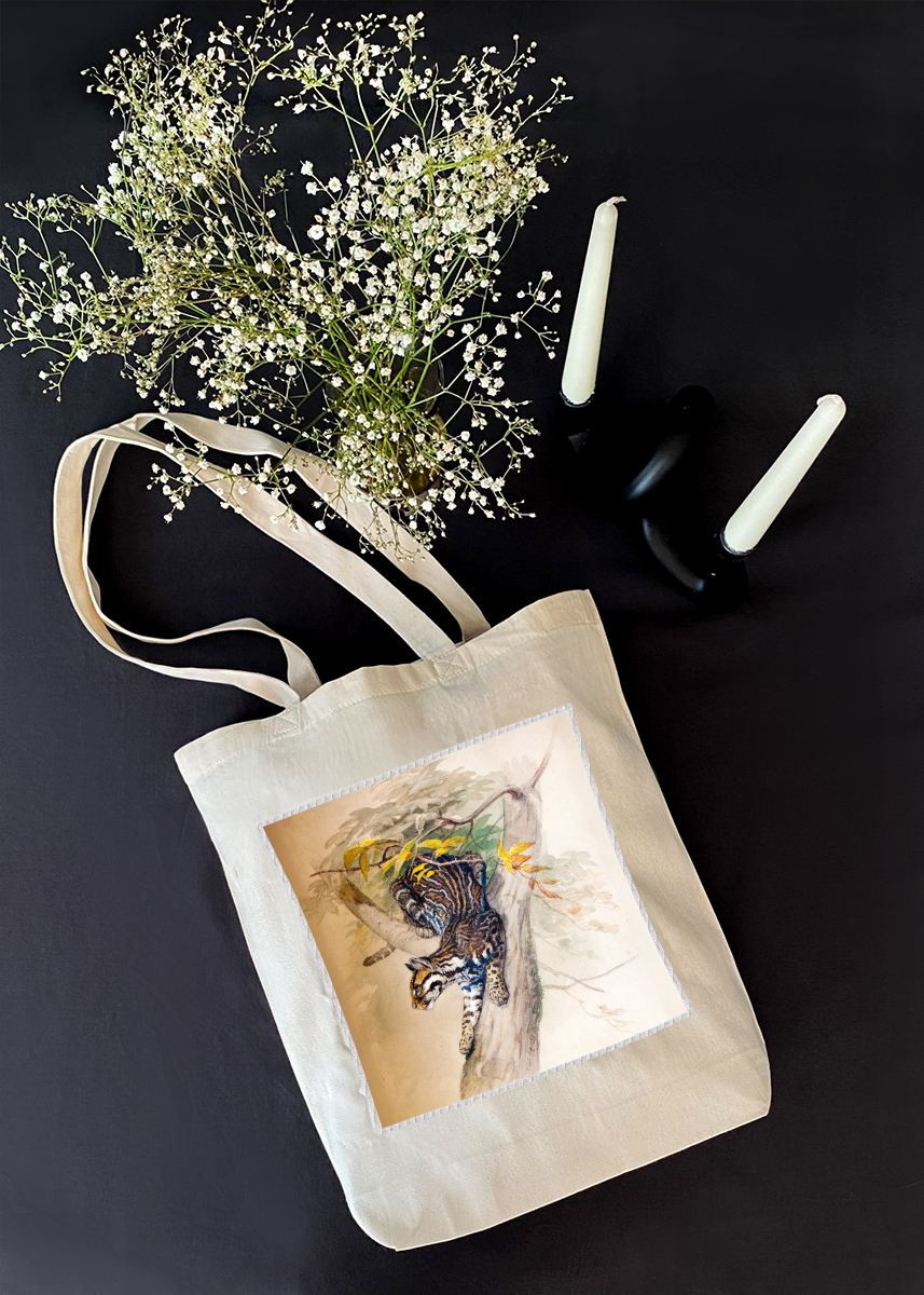 • Bawełniana torba z dużą naszywką z motywem sztuki malarskiej.