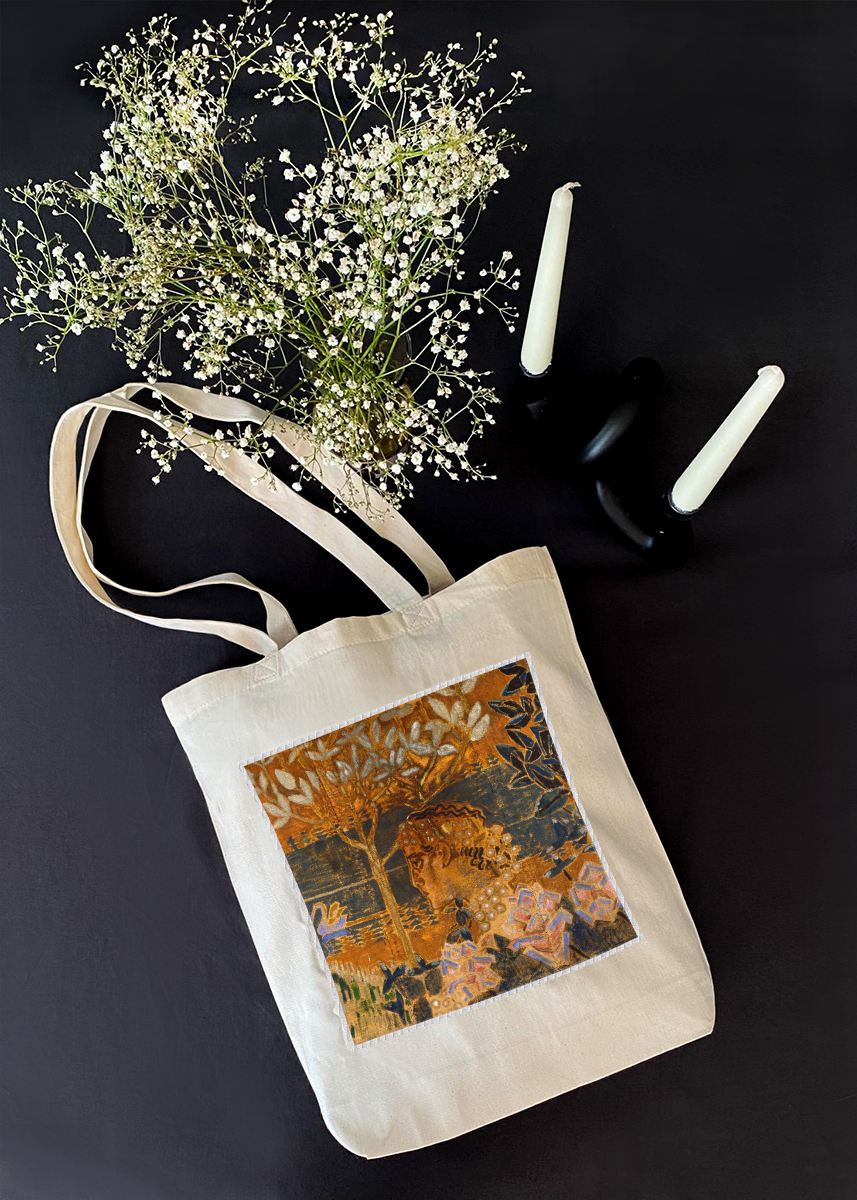 • Bawełniana torba z dużą naszywką z motywem sztuki malarskiej.