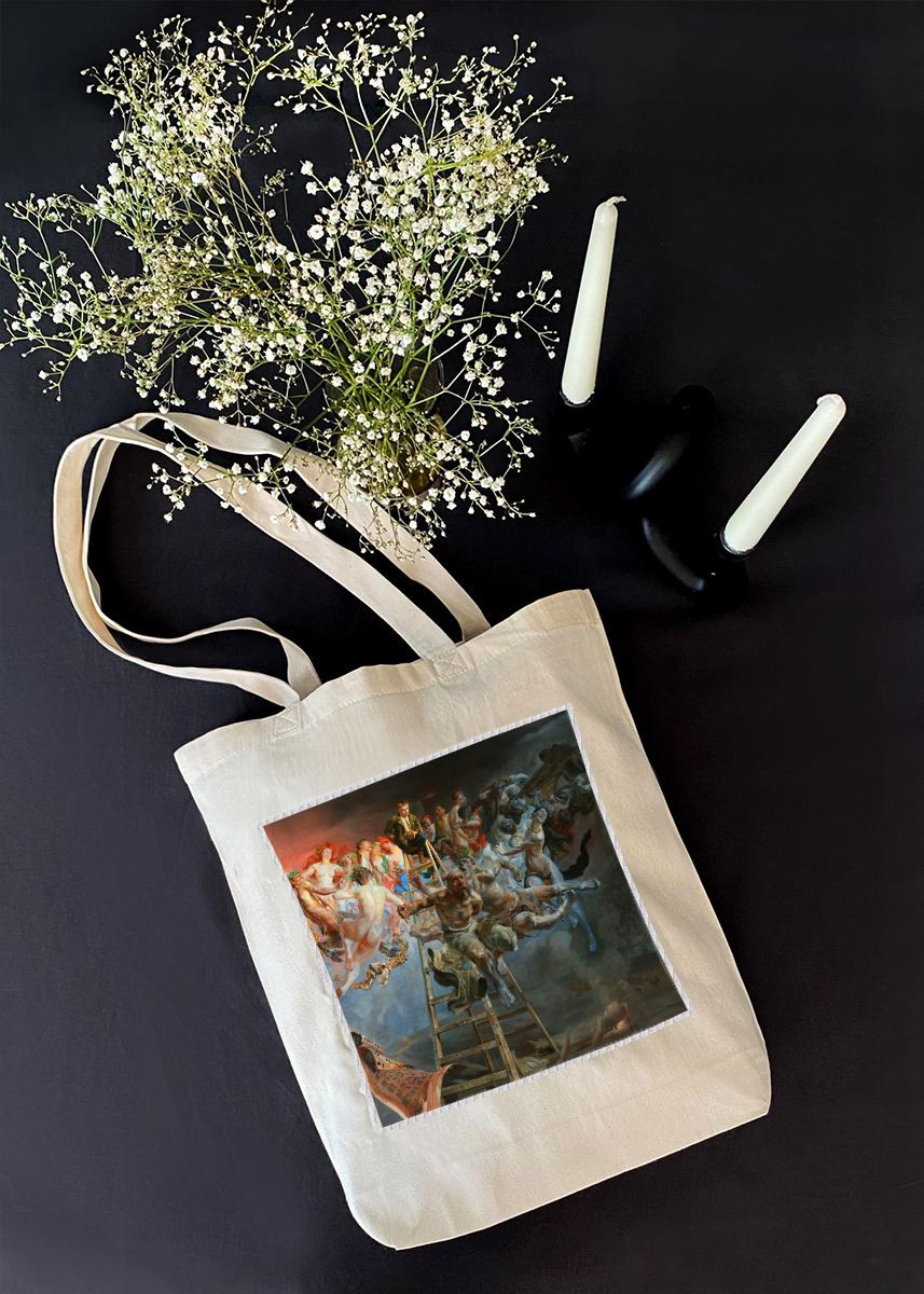 • Bawełniana torba z dużą naszywką z motywem sztuki malarskiej.