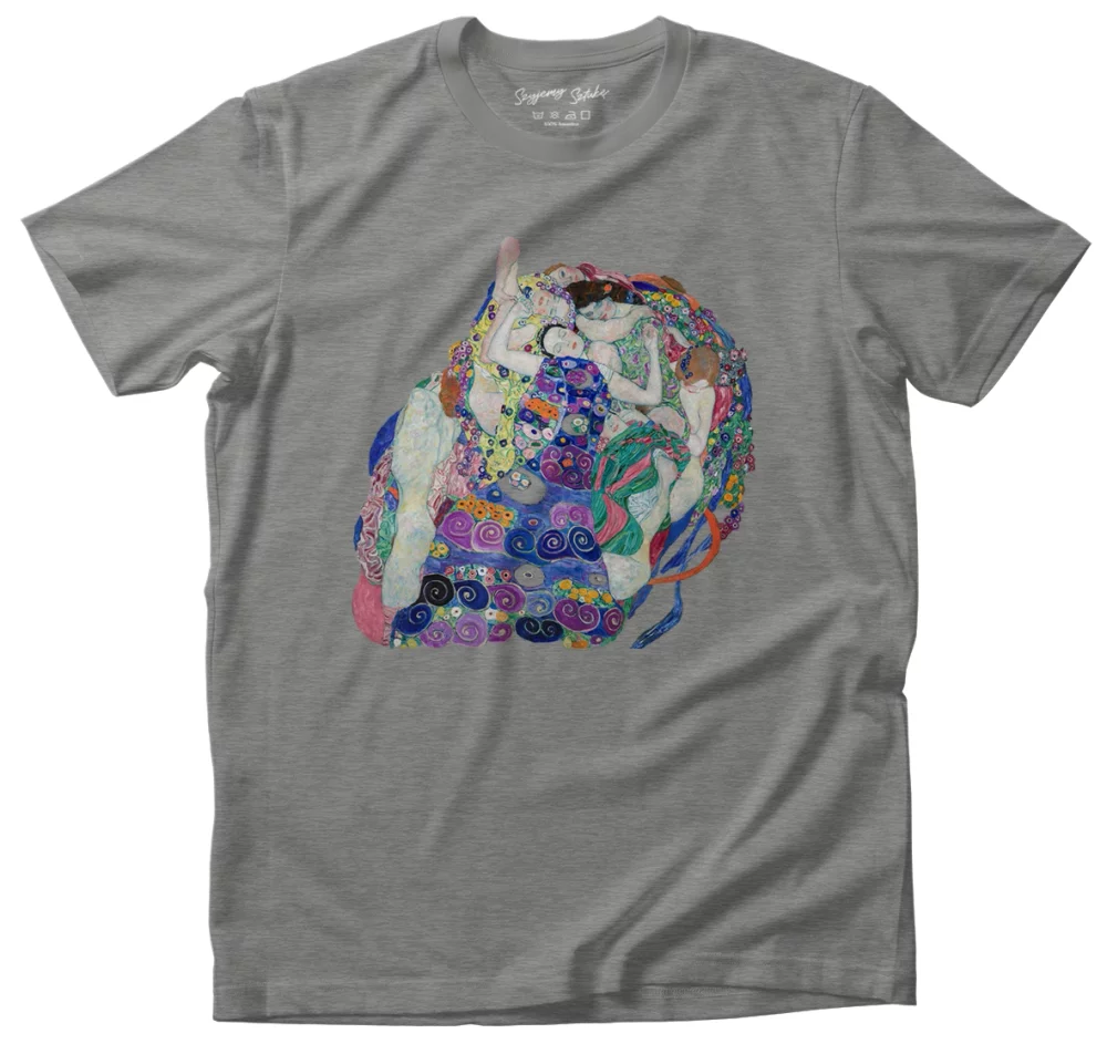- Koszulka Dziewica Gustav Klimt w wersji szara. Stylowa koszulka z nadrukiem dzieła sztuki, łączy wygodę i artystyczny charakter. Idealna propozycja dla miłośników sztuki.