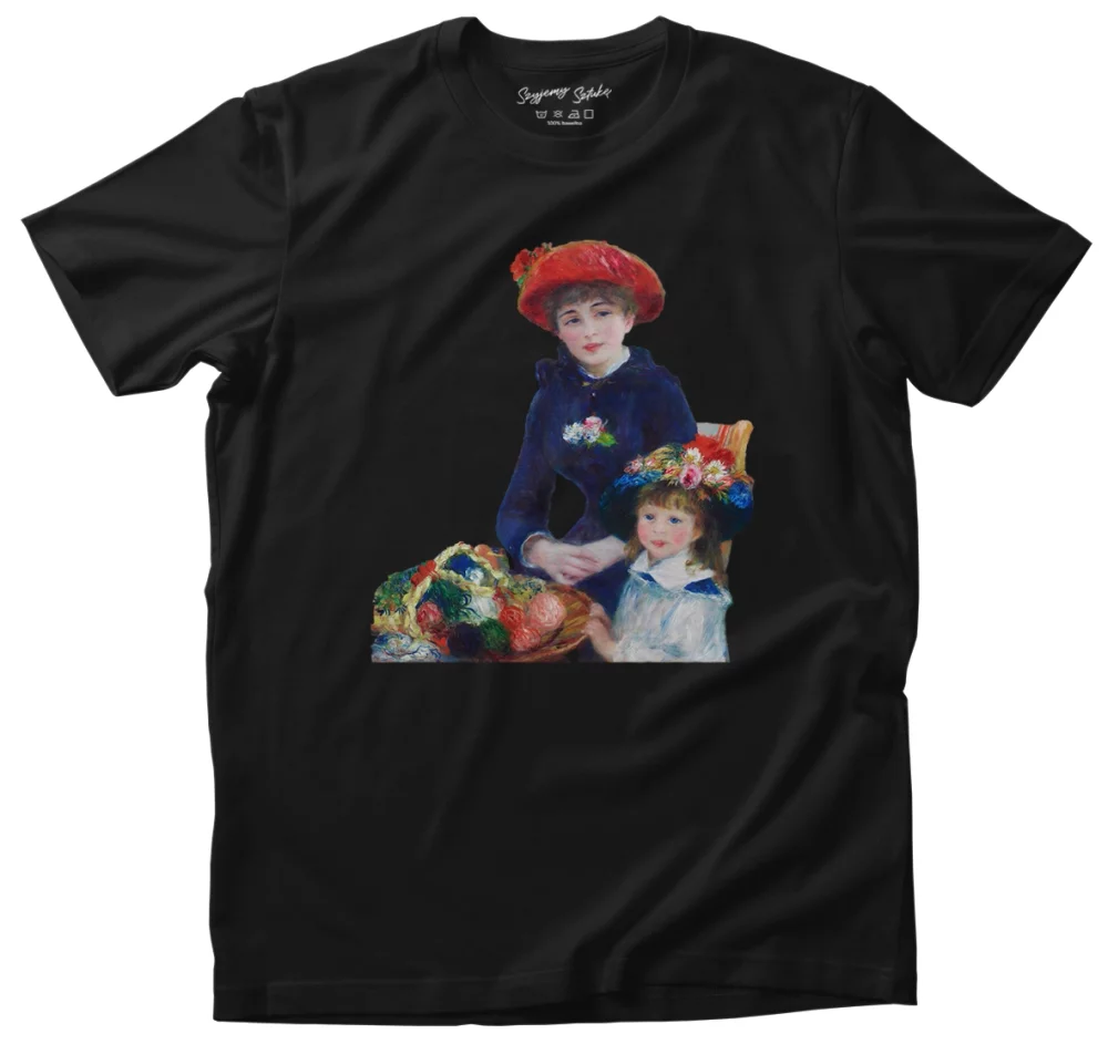 - Koszulka Dwie siostry (na tarasie) Pierre-Auguste Renoir w wersji czarna. Stylowa koszulka z nadrukiem dzieła sztuki, łączy wygodę i artystyczny charakter. Idealna propozycja dla miłośników sztuki.