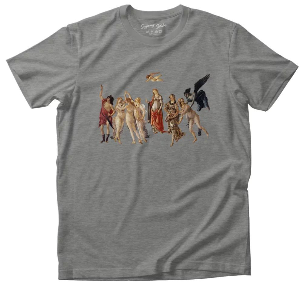 - Koszulka La primavera (Wiosna) Sandro Botticelli w wersji szara. Stylowa koszulka z nadrukiem dzieła sztuki, łączy wygodę i artystyczny charakter. Idealna propozycja dla miłośników sztuki.