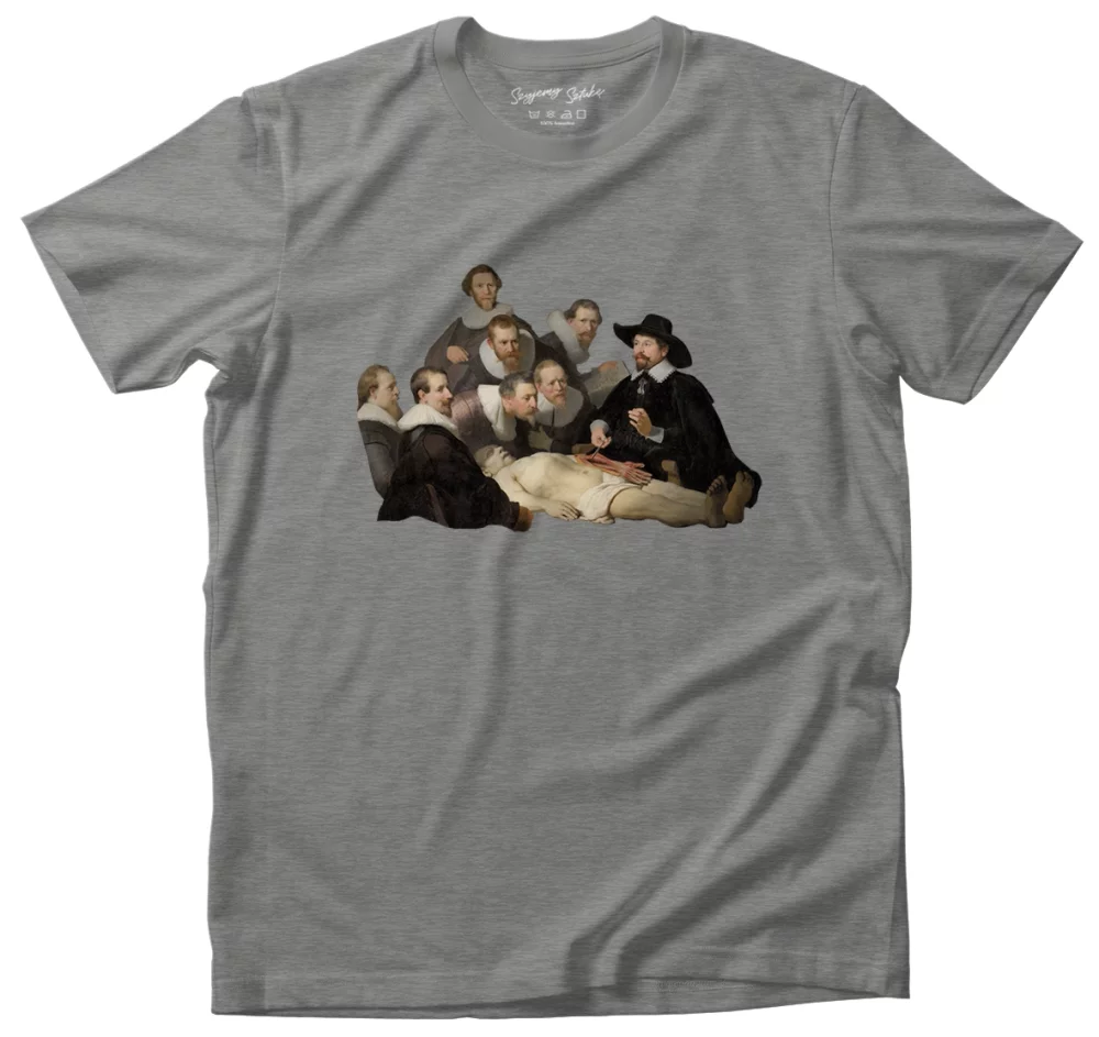 - Koszulka Lekcja anatomii doktora Tulpa Rembrandt w wersji szara. Stylowa koszulka z nadrukiem dzieła sztuki, łączy wygodę i artystyczny charakter. Idealna propozycja dla miłośników sztuki.