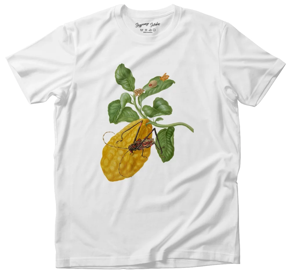 Przedstawiamy koszulkę z nadrukiem Cytryna z gąsienicą małpy i chrząszczem harlekin Maria Sibylla Merian 🎨