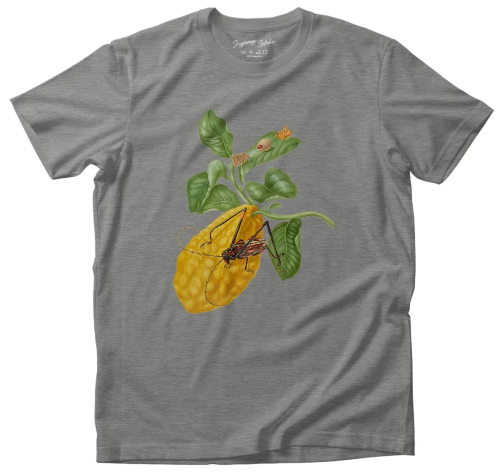 Przedstawiamy koszulkę z nadrukiem Cytryna z gąsienicą małpy i chrząszczem harlekin Maria Sibylla Merian 🎨