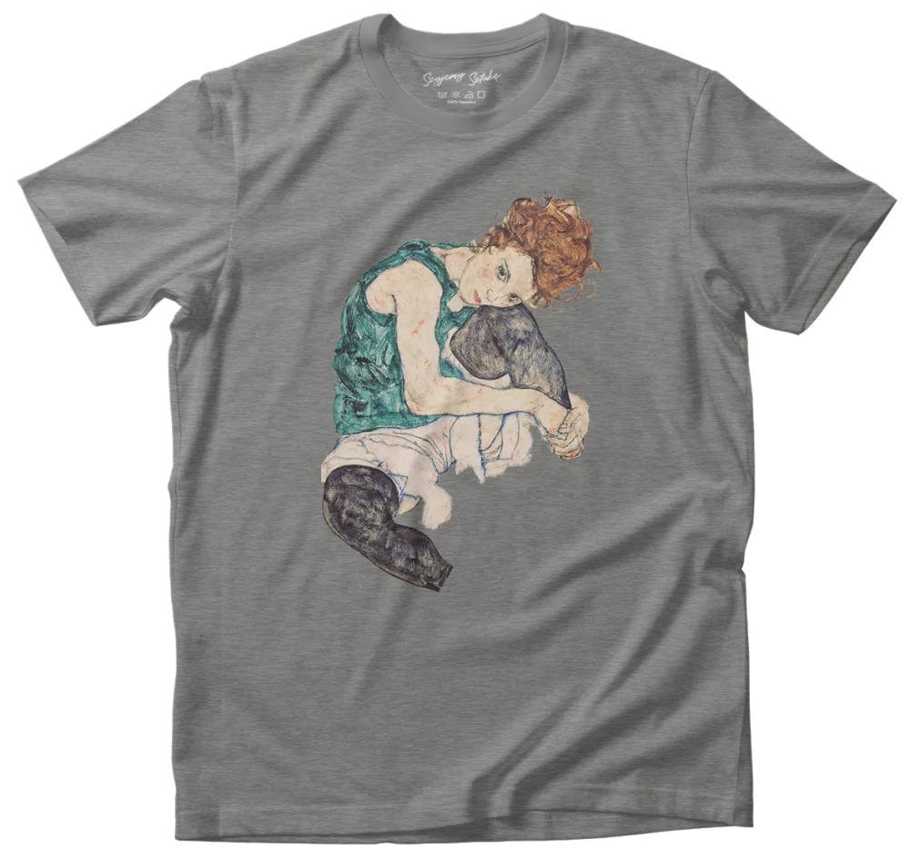 - Koszulka Siedząca kobieta z podniesionym kolanem Egon Schiele w wersji szara. Stylowa koszulka z nadrukiem dzieła sztuki, łączy wygodę i artystyczny charakter. Idealna propozycja dla miłośników sztuki.