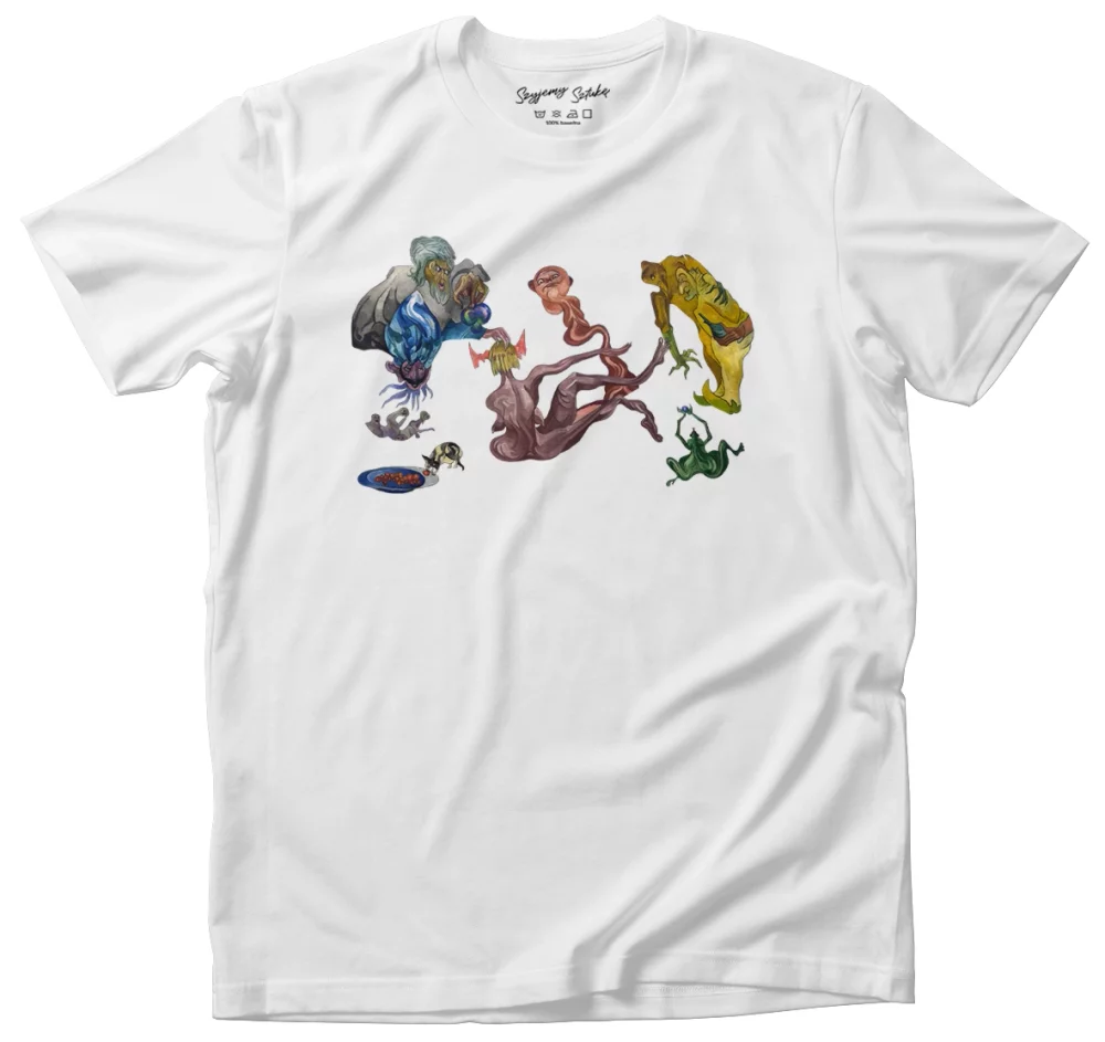 - Koszulka Tworzenie świata Witkacy w wersji biała. Stylowa koszulka z nadrukiem dzieła sztuki, łączy wygodę i artystyczny charakter. Idealna propozycja dla miłośników sztuki.